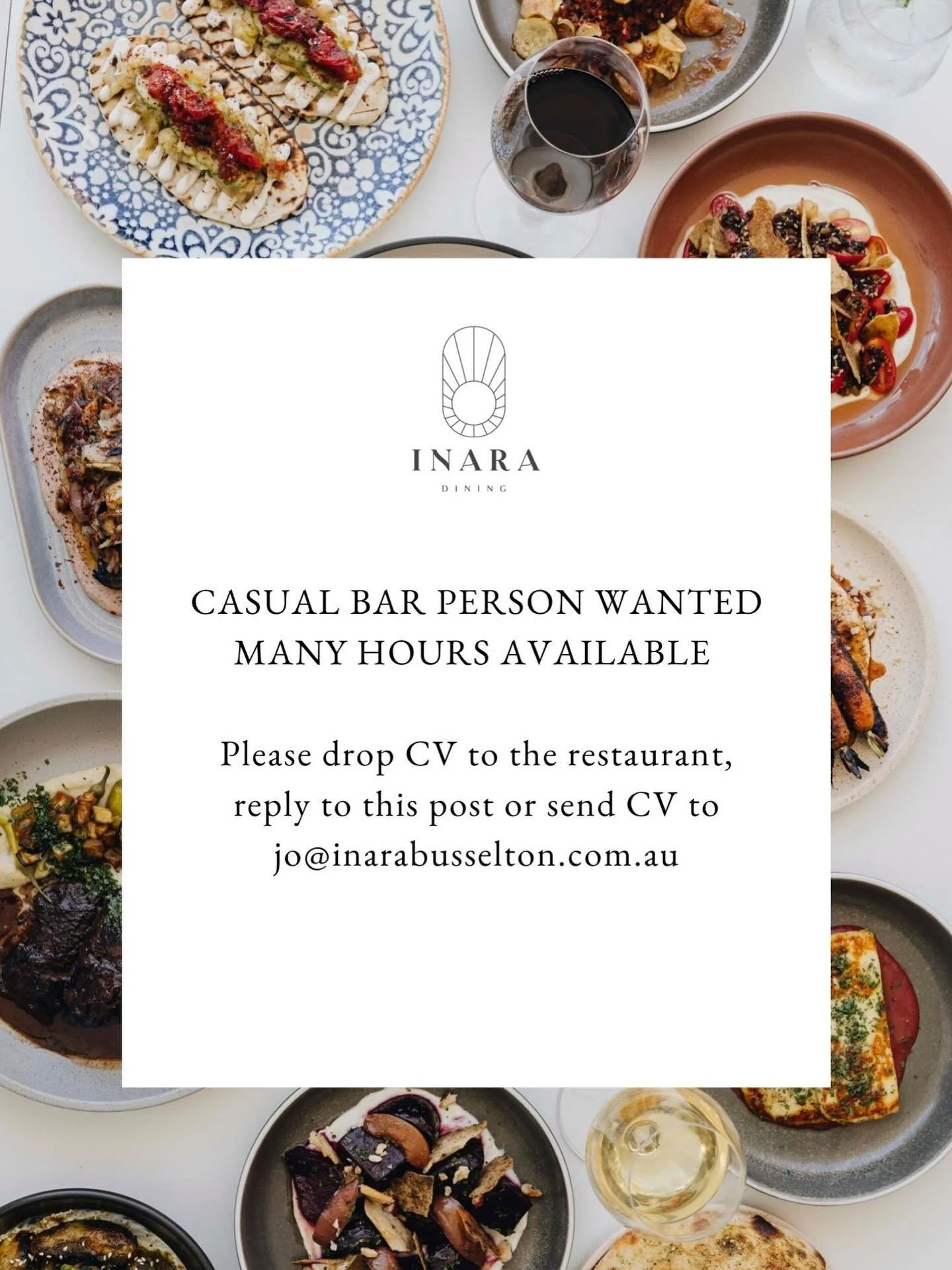 Meaning ‘Ray of Light’ in Arabic, INARA has illuminated Busselton’s food scene since opening in November 2023, creating an exciting and generous flavour journey through the middle east. We offer lunch and dinner and both inside and alfresco dining. Seasonal a la carte and set menu choices create many ways to enjoy the dining experience.